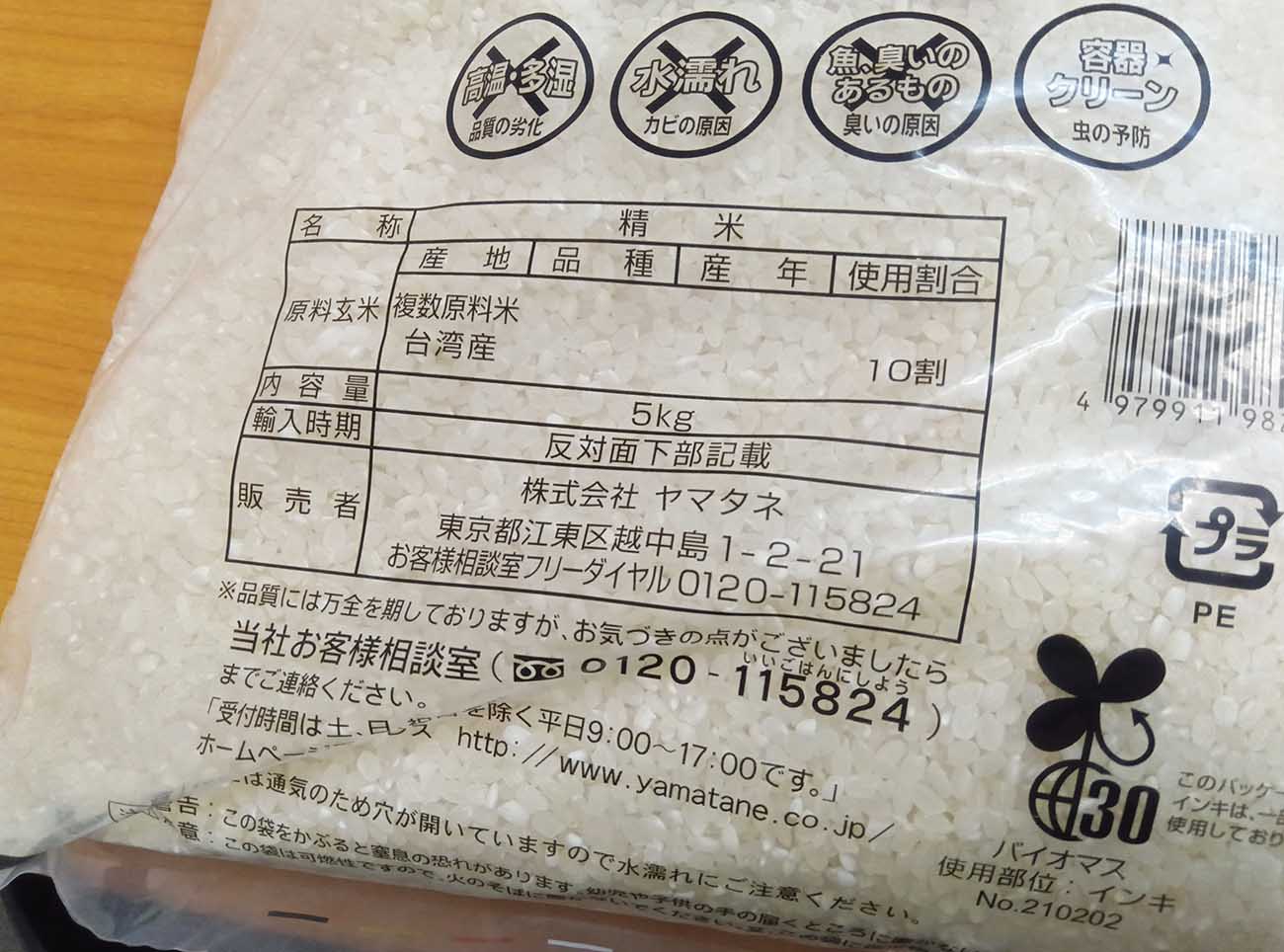 5kg税込3229円のこの輸入米。3000円超えてるから高騰前の米価格で考えるとあまり安さを感じない人もいるかもしれないが、ゆめぴりか(5kg税込4525円)とかこしひかり(5kg税込4417円)などの日本ブランド米よりは1000円以上安く売られていた。
