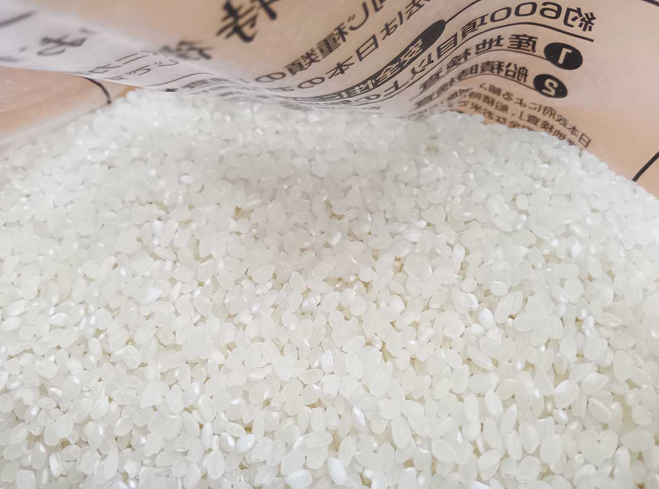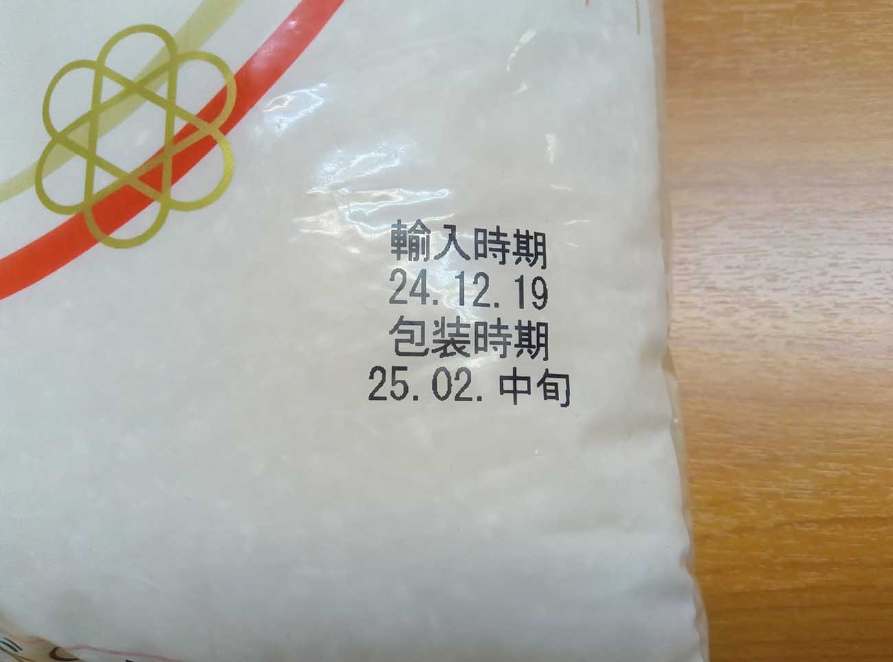 袋には輸入時期と包装時期が別々に明記されている。この米は昨年2024年の12月19日に輸入されたものの様子。裏には日本のお米と同じ種類のジャポニカ種であることが記載されている。
