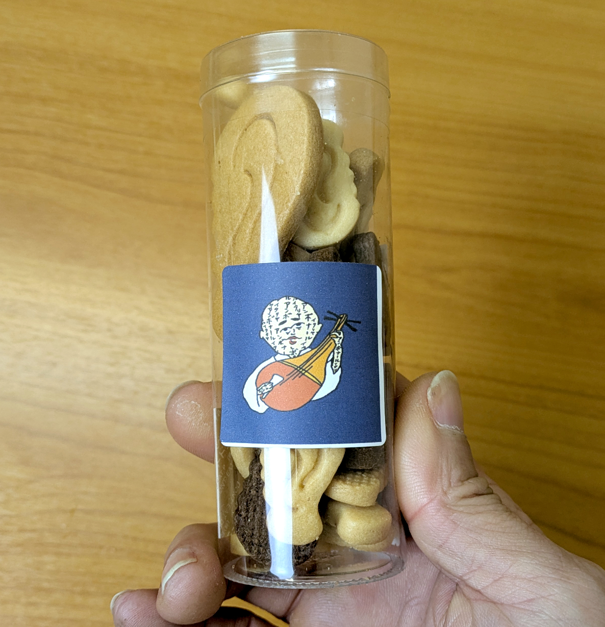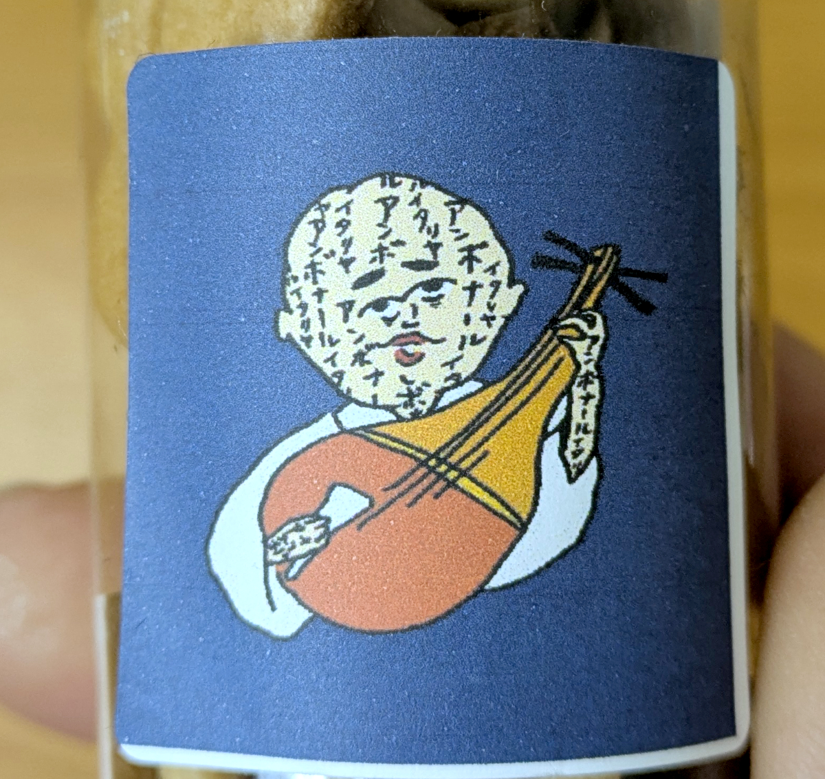 このイラストは芳一か? 耳があるように見えるのは気のせいだろうか。そして全身にお経が記してあるのかと思ったら、「アンボナール」の文字。これは製造元の洋菓子店の名前だな。