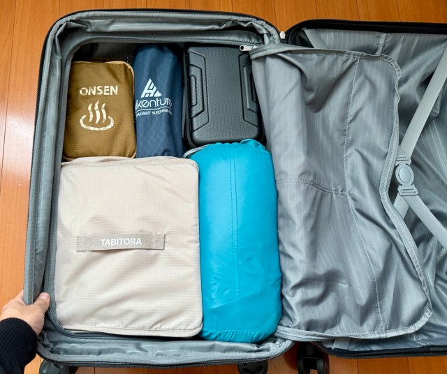 先述のように荷物は十分入るし、仕切りがあるから整理もしやすい。余裕がある場合は、スーツケースの半分(なんならそれ以上)をお土産スペースに空けておくのがおすすめ。