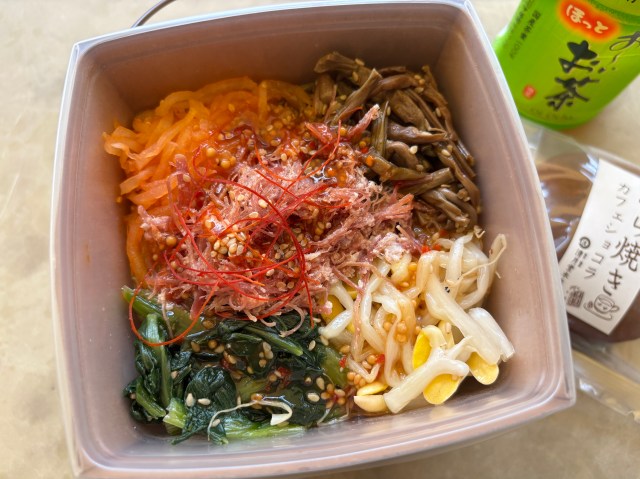 腰塚のコンビーフ丼、めっちゃ美味しい〜! ビビンバみたいになってて旨みがとろけるコンビーフに、甘酸っぱいキムチやナムルの味が合う〜!