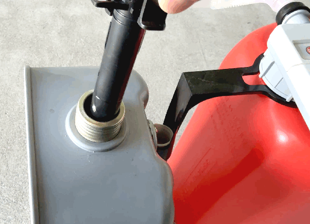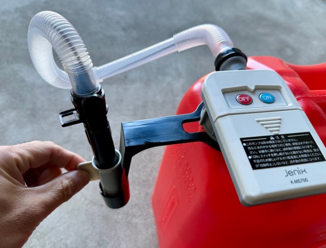 操作も一般的な電動ポンプと同じで、ホースをタンクの給油口に差し込んでツメを給油口のネジに挟んで真っ直ぐになるように固定する。