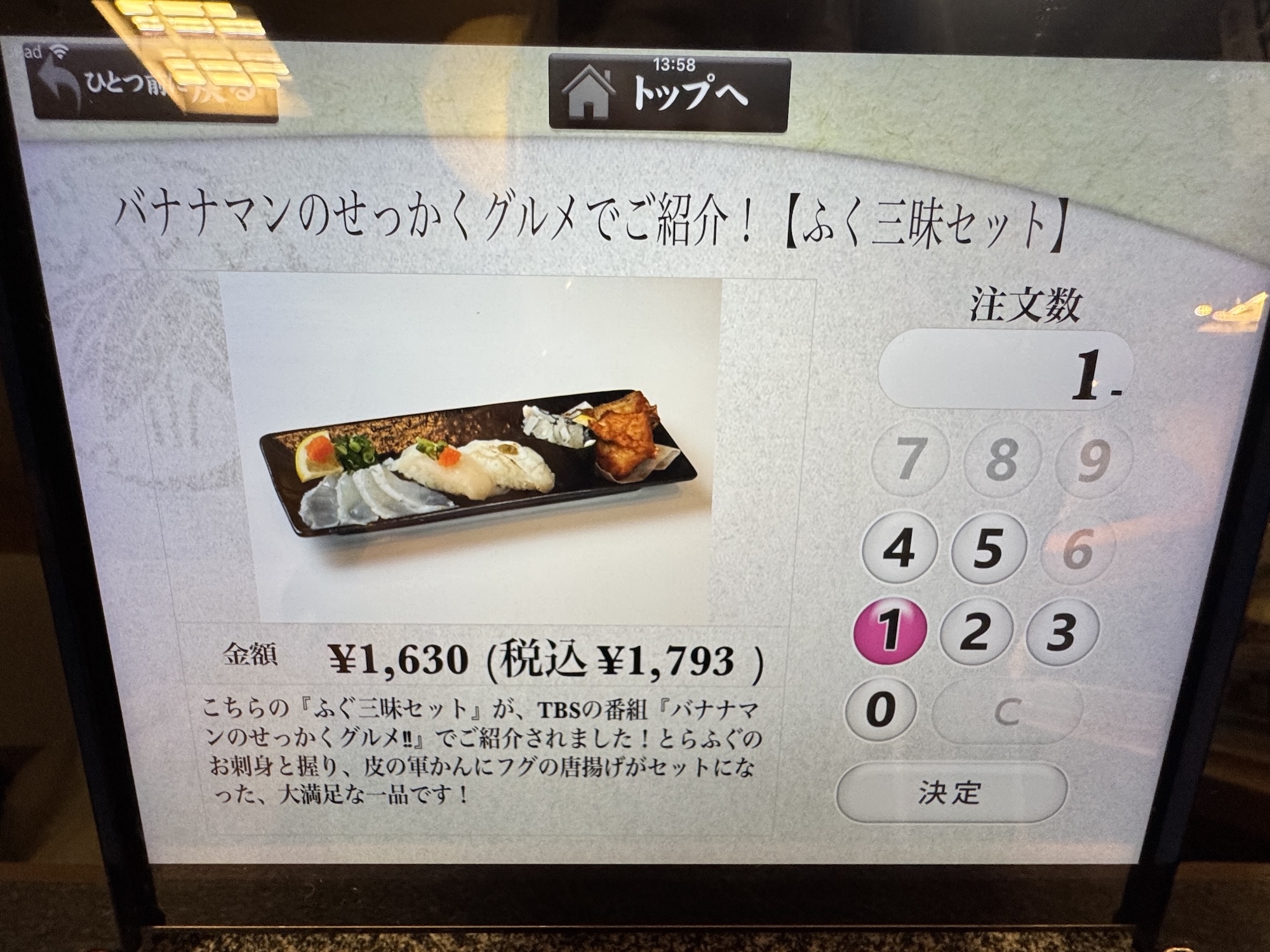 ここの人気No.1は『ふく三昧セット』(税込1793円)。市場でフグの相場を知った後だとずいぶん安く感じる。