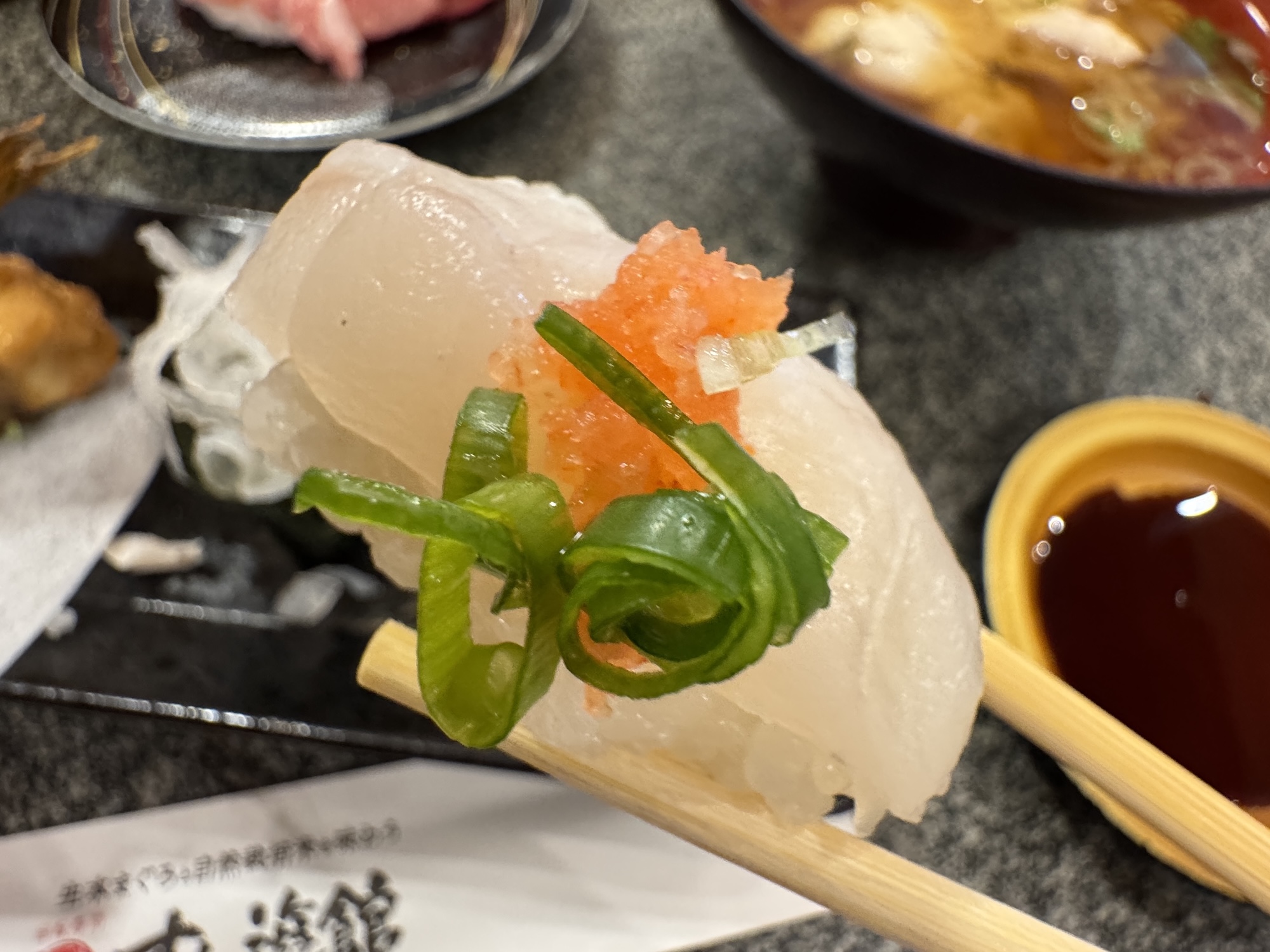 イカは噛むたびに「プチッ」と音がし、エビはザックリ肉厚。そしてアジは、ものすごく良い意味で “お父さんが釣ってきたアジ” みたいだった。 “お母さんが速攻さばいて刺身にした” までがセットのやつ。まさか下関で実家を思い出すとは想像だにしなかった。