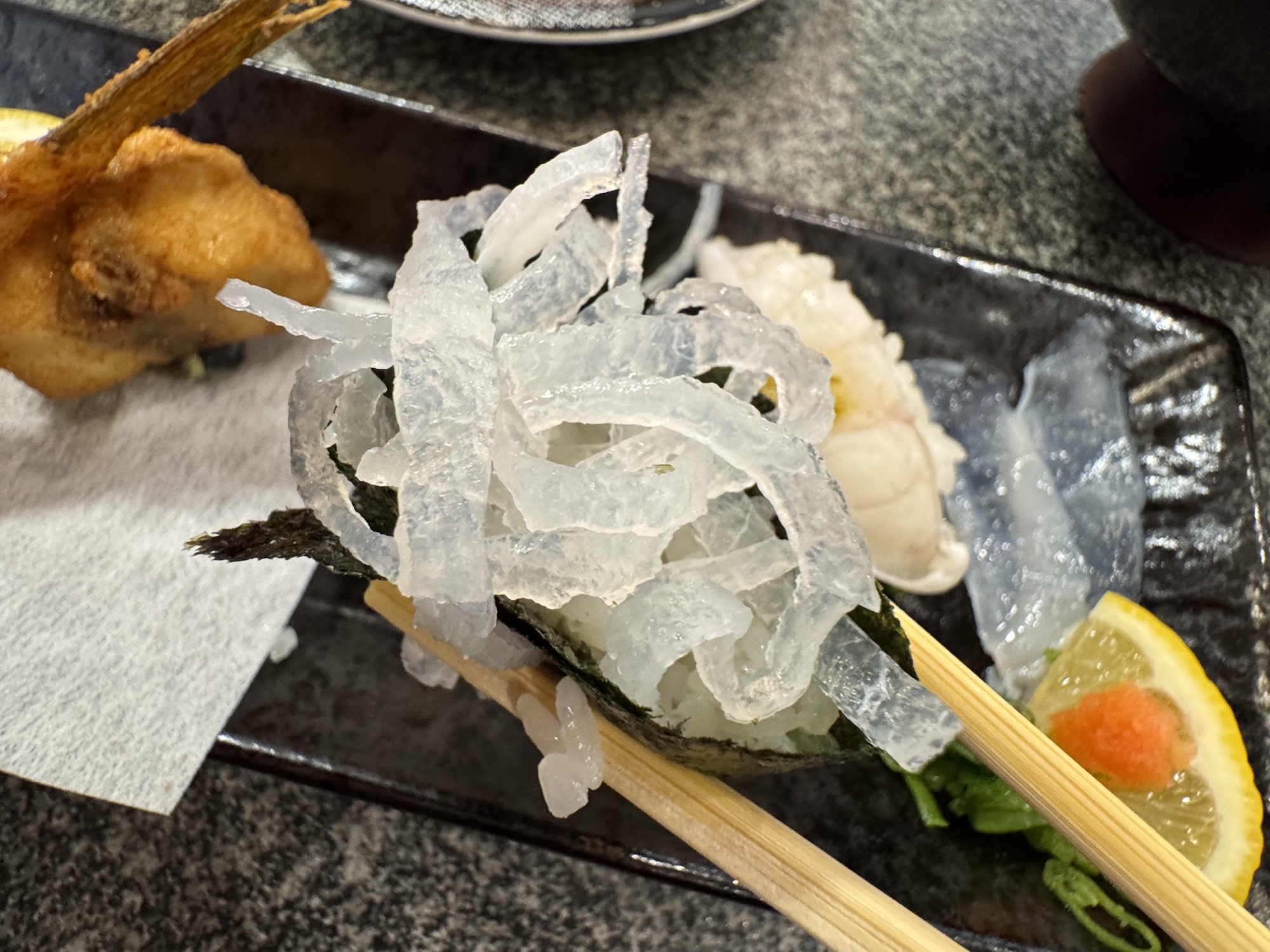 こっちはフグ皮の軍艦。間違いなく生まれて初めて食べる食い物。