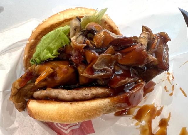 過去に当サイトでも食レポしていたが、雪国まいたけを200グラムも使用したという、これまたドムドムらしい破天荒なメニュー。通常店舗では単品890円と、バーガーとしてはやや高めの設定だが、絶対に食べたいと思っていた。