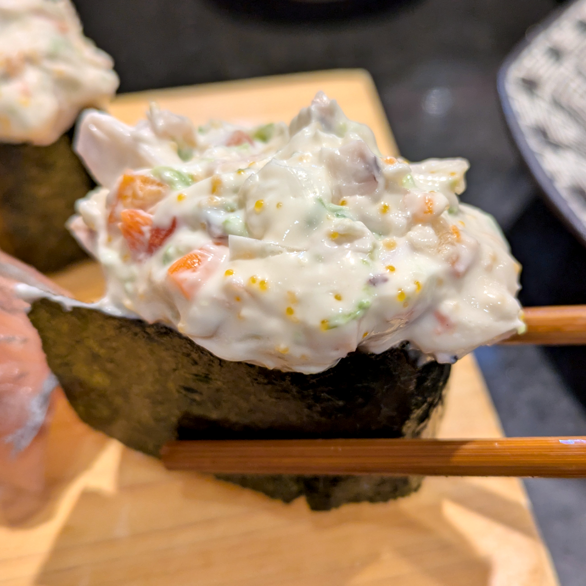 そんな長野の影響もあってか、ここ静岡でもサラダ軍艦は他県よりもしっかりとした一品として提供されている。事実、この軍艦はこぼれんばかりに具が乗っている。1貫でも食い甲斐があり頬張ると、口の中が祭り状態だ。主役を張れるくらいと言って良いだろう。決して、他のネタの引き立て役ではなかった。