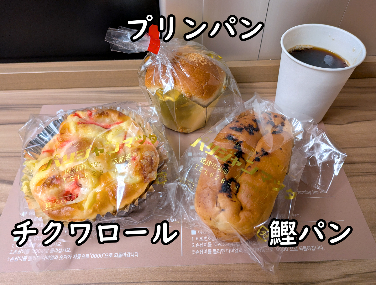 翌日の朝は、昨日パリジャンマツダで買ったパンからスタート。購入していたのは、気になった「鰹パン」(税込210円)、「チクワロール」(税込230円)、それに「プリンパン」(税込220円)である。