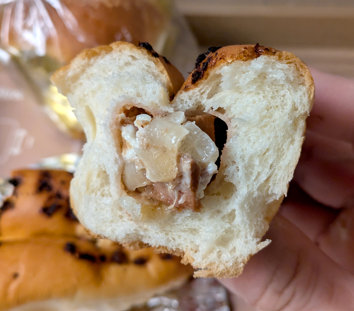中には、甘辛く味付けをした鰹の角煮。それから玉ねぎとマヨネーズである。それがパンに合うかというと……。合う! めっちゃ合ってる!! ご飯にも合いそうな具材が、パンともしっかり調和していることに驚いた。