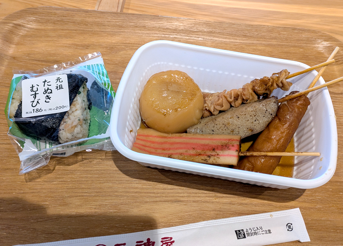 このお店はコミュニティスペースに設けられたお店で、フードコート形式のセルフサービス。したがって、おでんも自分で取る。パッと見た感じでどれが何だかわからなかったので、見た目で判断して5種のおでんをチョイスした。。それと「元祖たぬきむすび」(税込200円)も購入。