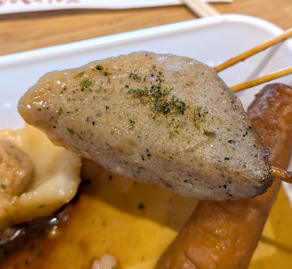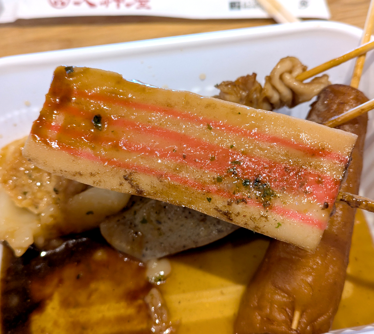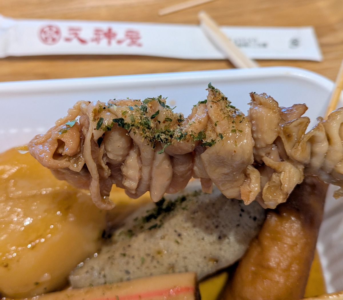 おでん粉とはダシ(削り節)と青のりを合わせたもの。静岡おでんにはコレが欠かせないらしい。それを振りかけて、まずは牛すじを~……。と思ったら、これは「鶏皮」(税込150円)だった! いろいろ戸惑う、静岡おでんは初心者に難しい……。