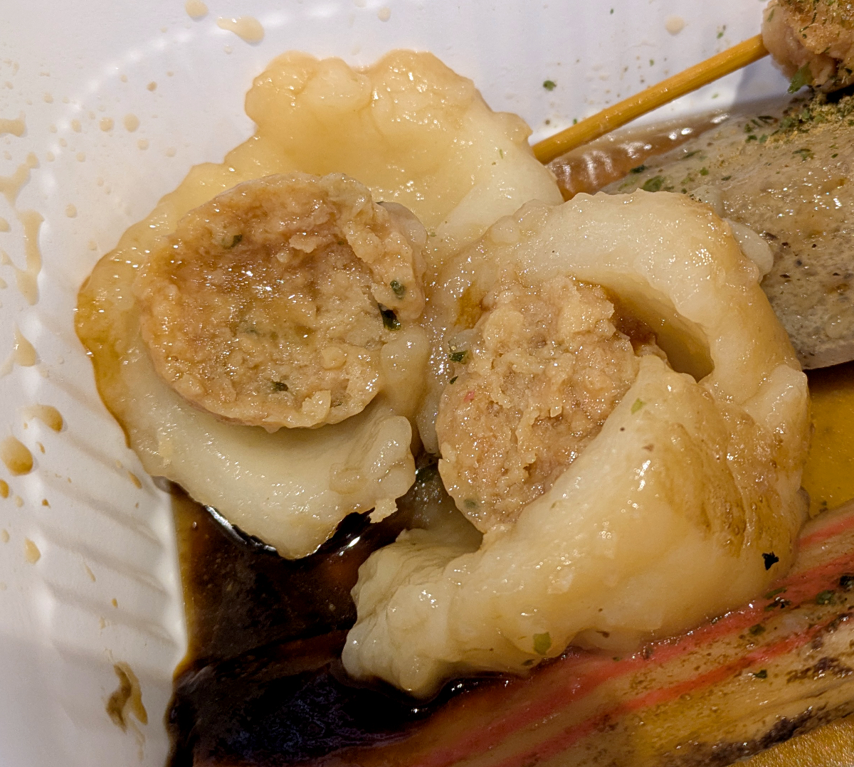 半割にすると何か出てきた! つみれが入ってる。コレはナニ? 周りはモッチリしていて、中からつみれ。食べても全然わからない。