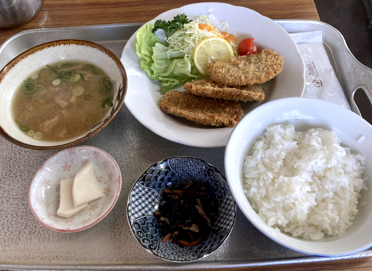 昭和から続く老舗の風情。おばあさんが1人でお店を切り盛りしている。壁に貼り出されたメニューを見て、この地域らしいものをと選んだのが「はんぺんフライ定食」(税込750円)だ。