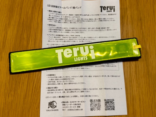 Amazonで買ったのは「TERUI Lights(テルイライツ)」なる夜間LED安全グッズ専門店が販売しているアームバンド。