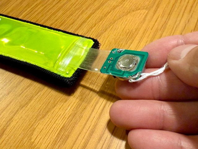 ジッパー部分を開けてヒモを引っ張ったら内側のバッテリーが出てくる仕組み。電池が切れたらコイン型リチウム電池「CR2032」を交換すればOK。