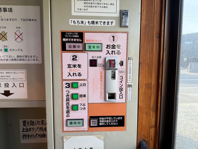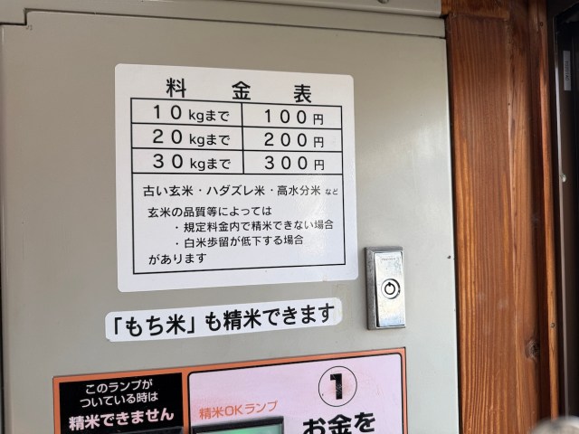 んで、料金は玄米10kgまで100円・20kgまで200円・30kgまで300円。流れは「お金を入れる」「玄米を投入する」「つき具合を選ぶ」とのこと。せっかくだから「7ぶつき」にしてみたい。いよいよ “分つき米” デビューである。