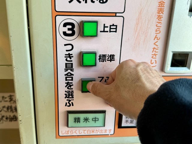 そんなわけで今回は、生まれて初めて「コイン精米所」とやらを利用してみることに。コインランドリーみたいに玄米を投入口に入れ、仕上がり(つき加減)を選択したら自動的に白米がタンクにたまるという。実際に流れをご覧いただきたい。