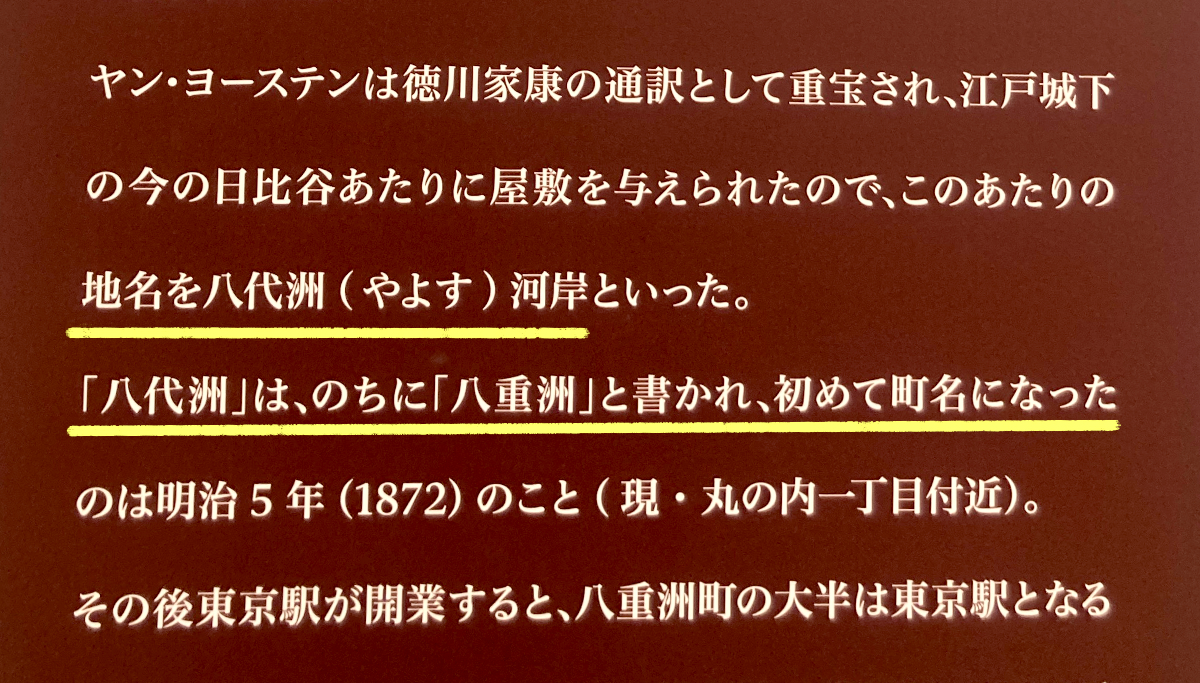 それで、八重洲の地名とどう結びつくかというと、ヤン・ヨーステンの日本名は「耶楊子(やようす)」という。そして彼が与えられた現在の日比谷あたりの屋敷は、先に出た「八代洲(やよす)河岸」と呼ばれていたそうだ。