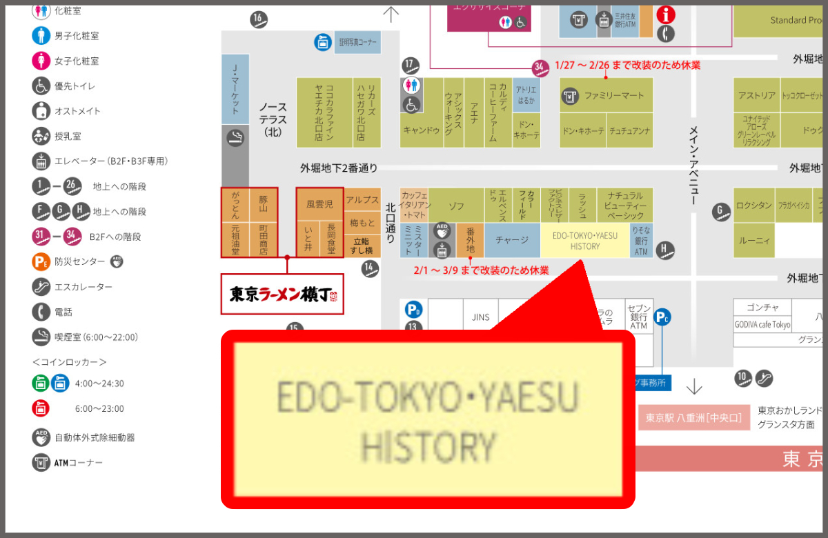 地下街を歩いていたところ、「東京ラーメン横丁」近くで「EDO-TOKYO・YAESU HISTORY」という展示物を発見した。その名の通りに、東京・八重洲周辺の歴史に関して紹介するコーナーだ。