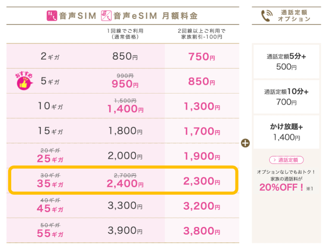 さらに5・10ギガプランと35ギガプランを値下げ。音声対応で5ギガプランは990円から950円、10ギガプランは1500円から1400円、35ギガプランは2700円から2400円となるようだ。