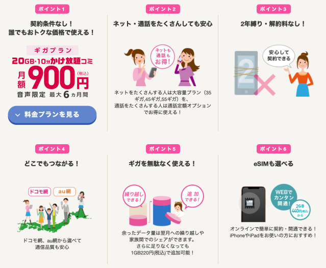 とくに注目すべきは10ギガプラン。本来「10ギガ1400円」のところ、6ヵ月間500円割引&10GB増量となり20ギガ900円で使える。
