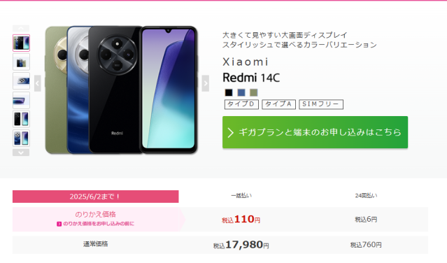 他社からの乗り換えで、人気スマホをお得に購入できるキャンペーンも実施中。たとえば、Xiaomiの人気機種「Redmi 14C」は一括払いで110円らしい。
