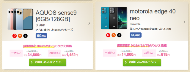 さらに、AQUOS sense9が34800円、motorola edge 40 neoが14980円だったりと衝撃的な価格のラインナップで身震する。