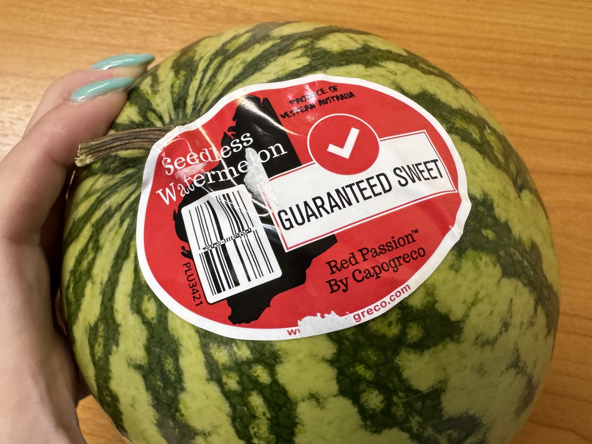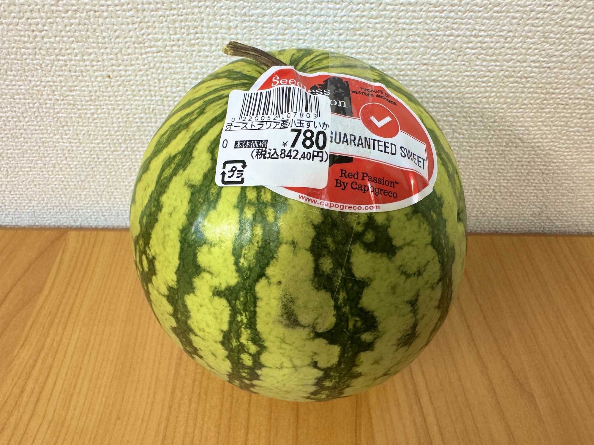 この日(2月下旬)購入した『オーストラリア産 小玉すいか』は税込842円。重さは約1.4キロだった。スイカの値段はピンキリなので何とも言えないが、輸送コストを考えると格安スイカの部類な気がする。
