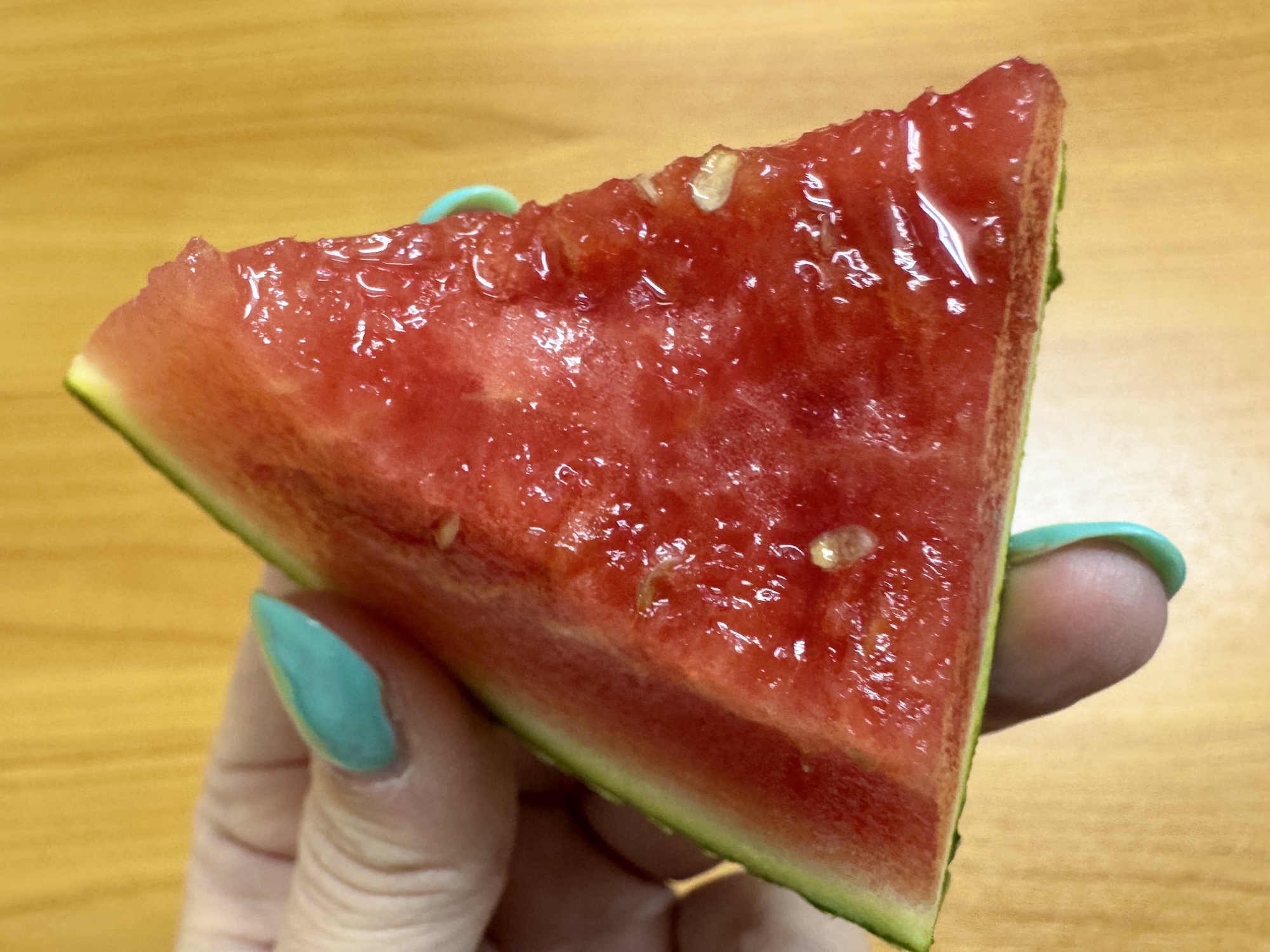 タネは我々のよく知る黒くて硬いヤツではなく、よほど神経質な人でなければそのまま食べちゃえる程度に小さくて柔らかい。私がスイカをあまり好まない最大の理由「タネ周辺がグジュグジュしていて舌触りが悪い」が完全解決しており、コスパも加味するとワンチャン「日本のスイカより優秀」まであるのではないか。