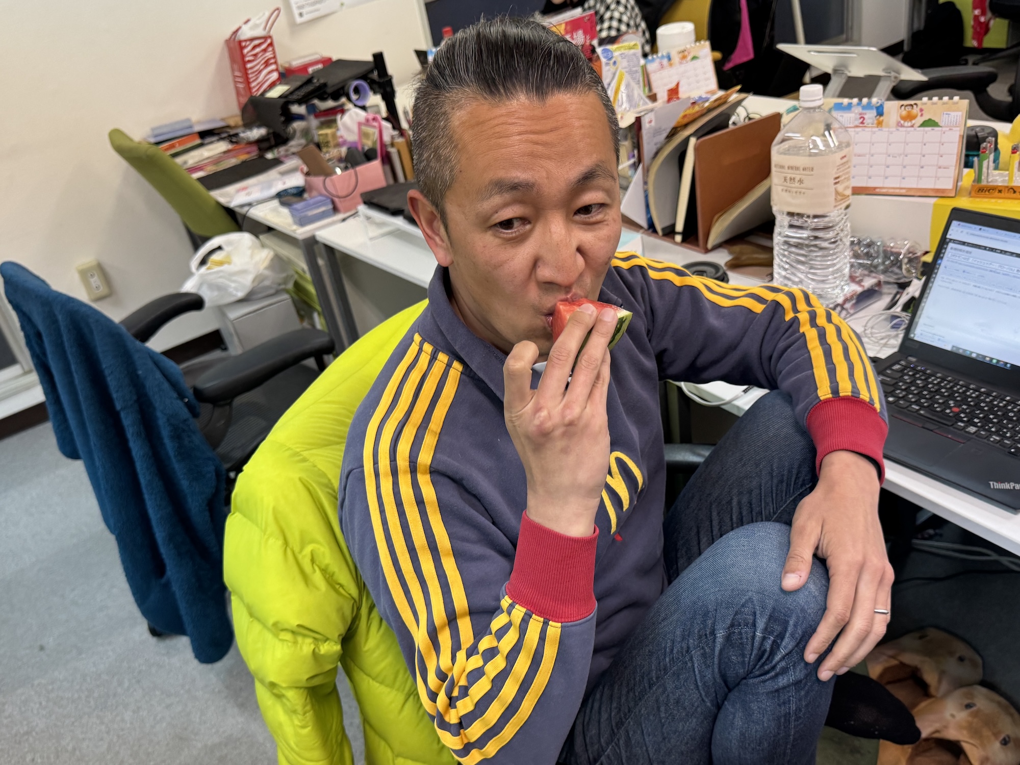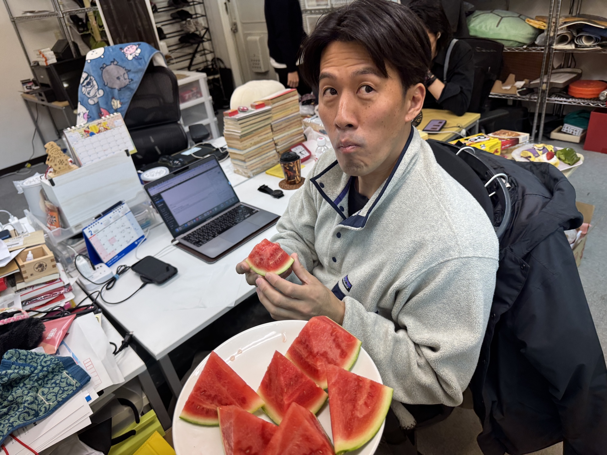 砂子間「ウマいッスね! 夏のスイカと変わらない。最近の栽培技術はスゴいなぁ」