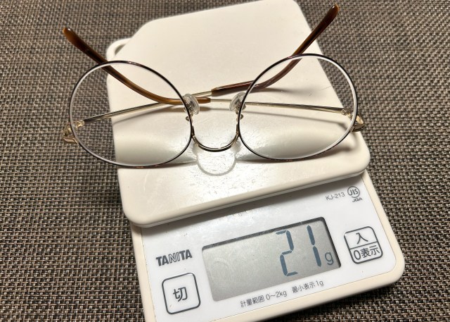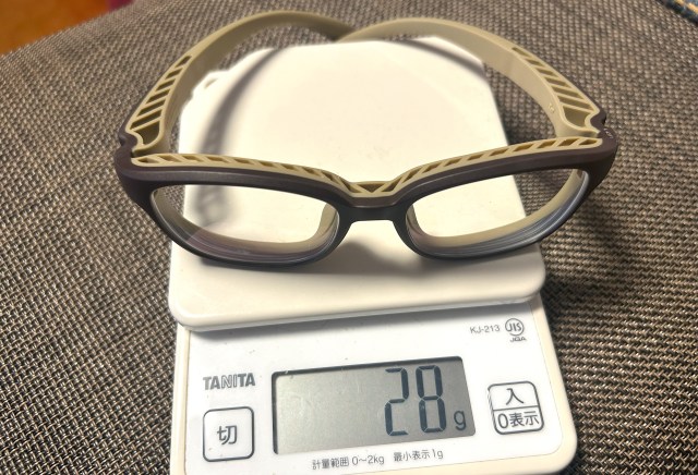 家に帰りコンタクトを外し、さっそく装着してみる。あまりに軽くてびっくりしたので重さを量ってみると、28gだった。しかし、普段記者が使っているメガネを量る21g。飛び抜けて軽量という訳ではなさそうだ。