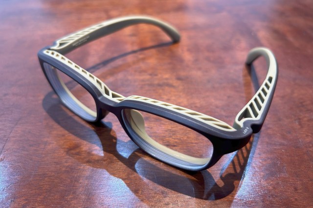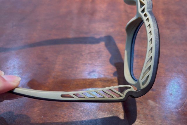 また面白いのがレンズ周りと耳にかける部分。いずれも縁を太目に作り、間に穴を通すつくりになっている。こうすることで、ちょっとした衝撃に負けない強度が生まれていると考えられる。