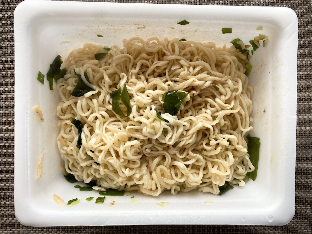 ほい、完成! 湯切りしたら海鮮系の匂いが広がる……っていうか、かやくとして入ってたワカメがかなり主張をしてきたからビビった。もしかして結構クセ強系?