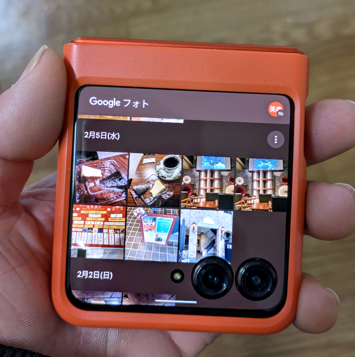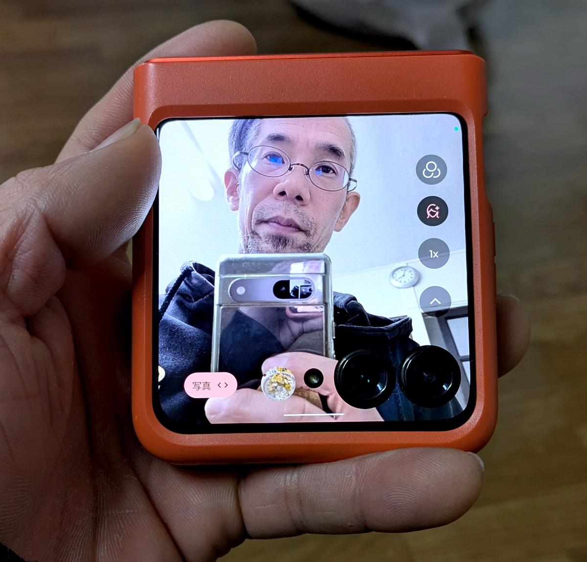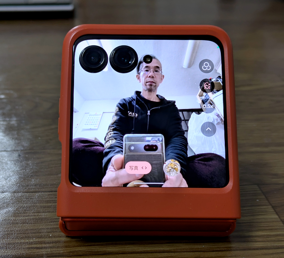 外部ディスプレイを見ながら、外部カメラで撮影できるのも2つ折り端末の強み。