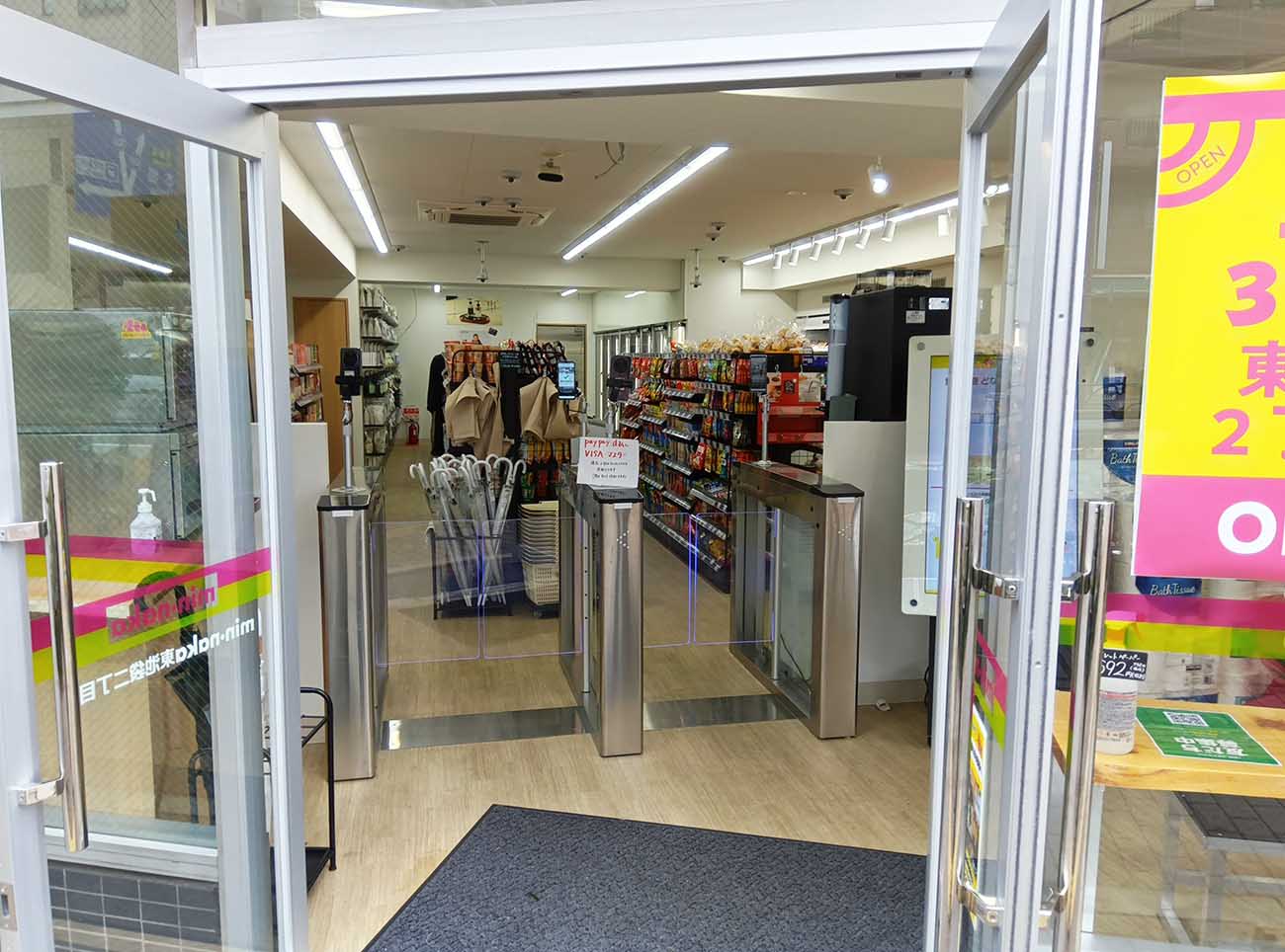ミンナカは入口にセキュリティゲートがあるのがコンビニとしては珍しい。だが、別に会員証がいるとかそういうわけではなく、ゲート前に行くと普通に開いた。どうやら、このゲートは顔認証による情報管理を目的としている様子。