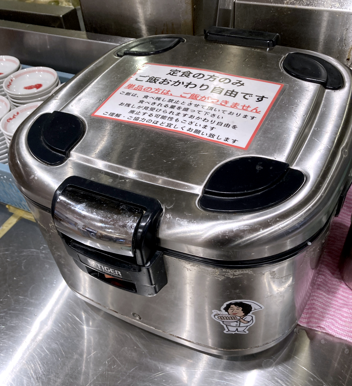 だが、「もうすぐ炊けますので、少しお待ちください」。よかった! 釜を入れ替えるタイミングだったのね。それで一旦、券売機を止めたということらしい。よかった、マジで。