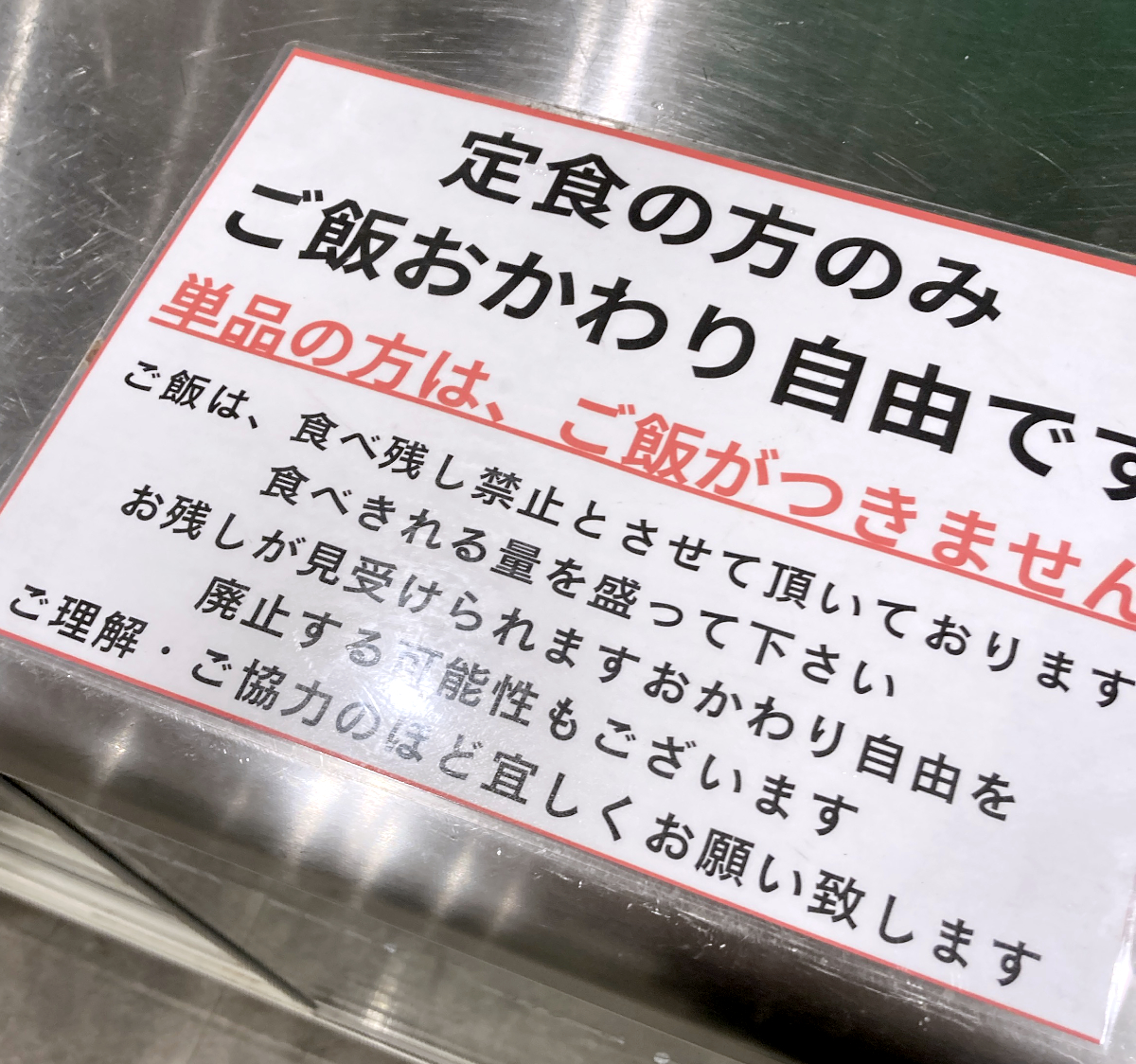ジャーの上には食べ残しに関する注意書きがある。米価が高い中でもおかわり自由にしているのに、食べ残されたらお店にとってたまったものではない。廃止にならないように、食べられる量だけ取るようにしよう。