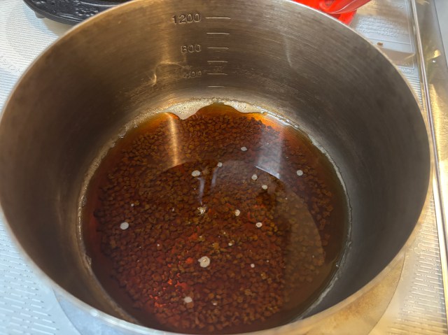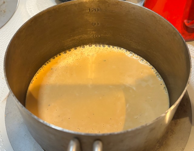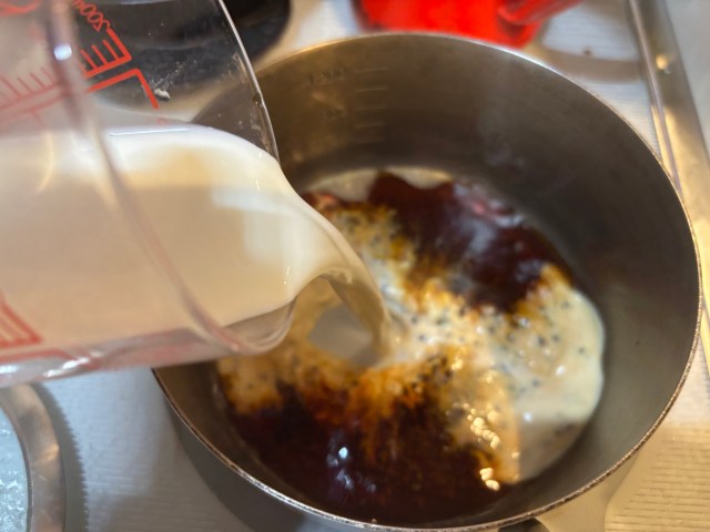 ④牛乳100CCを鍋にいれて、弱火で加熱する。