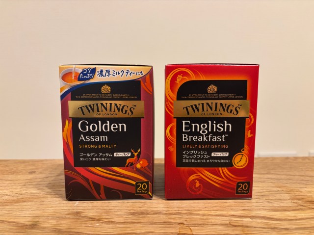 トワイニングの「イングリッシュブレックファスト」や「ゴールデンアッサム」なんかは手に入りやすい思う。この辺はケチらずにティーバッグを2袋くらいドボンすると濃いミルクティーが作れる。(ティーバッグ1袋あたり茶葉2gで量が少ないから2袋入れるの推奨)
