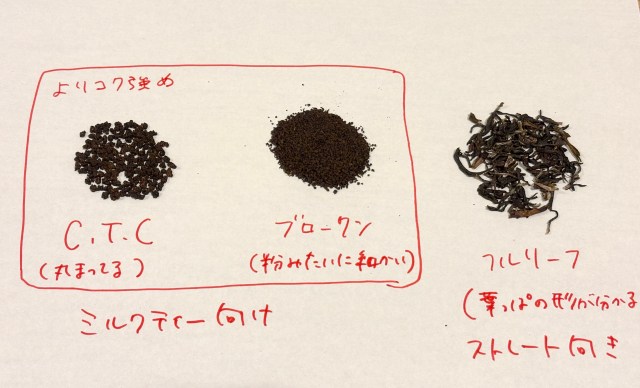 茶葉が細かいもののほうが抽出しやすく、濃く淹れられるため、ミルクを入れても風味がまけないことが多いのだ。