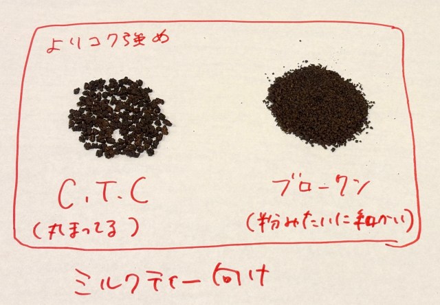 と書いてあるような品種・ブレンドはミルクティー向けで細かい茶葉や丸まったCTC製法のものが多い。