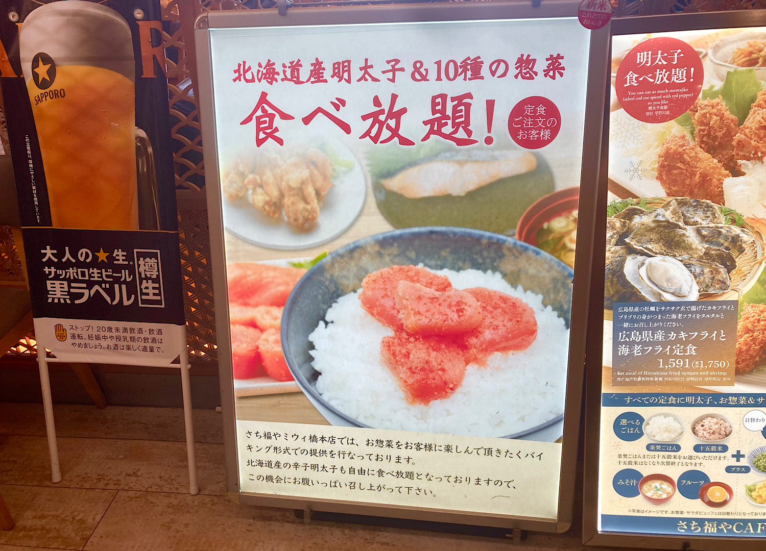 しれっと終了してたらどうしようと思っていたが、店前にデカデカと「食べ放題!」の文字。良かった、やってた。
