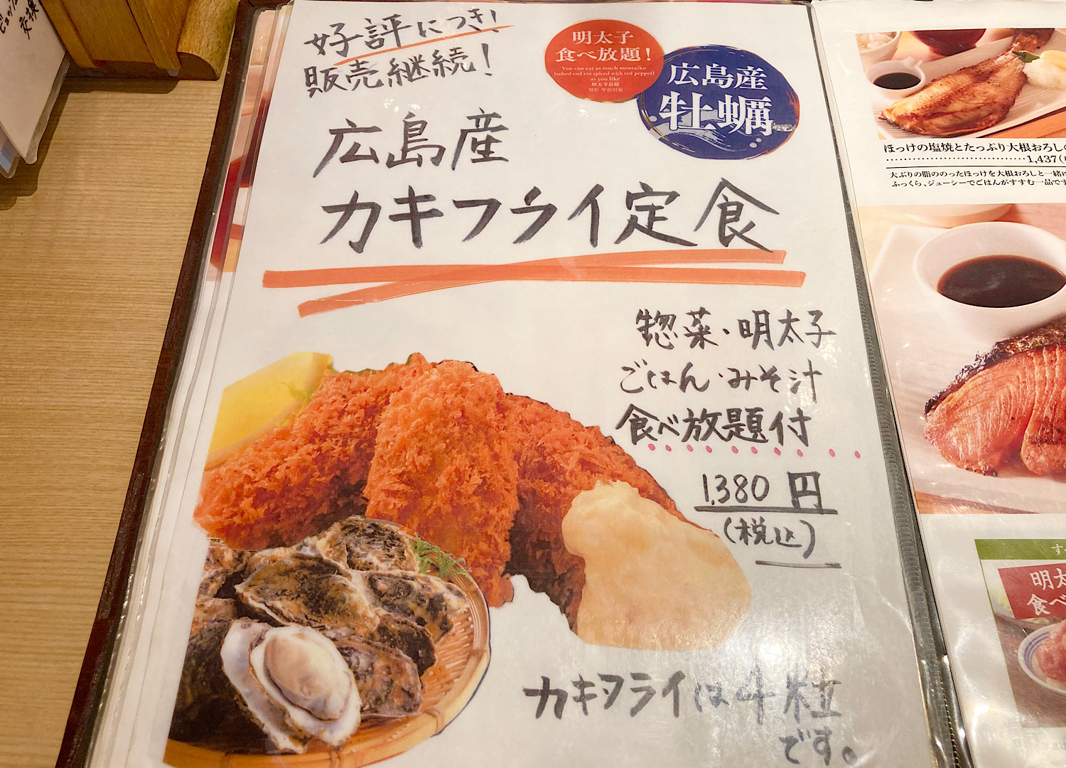 なんか期間限定っぽかったので「カキフライ定食」を注文。1380円。