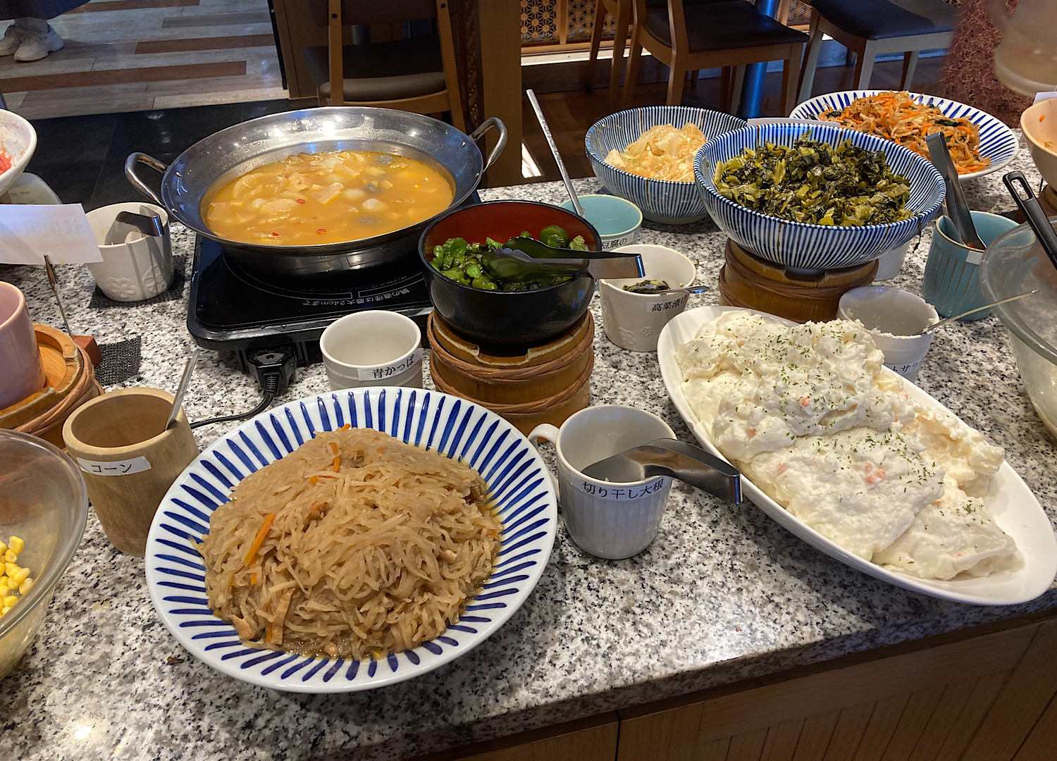 着席と同時に渡されたお惣菜用のお皿は一人一枚の交換制だ。お皿を手に、いざビュッフェ台へ。
