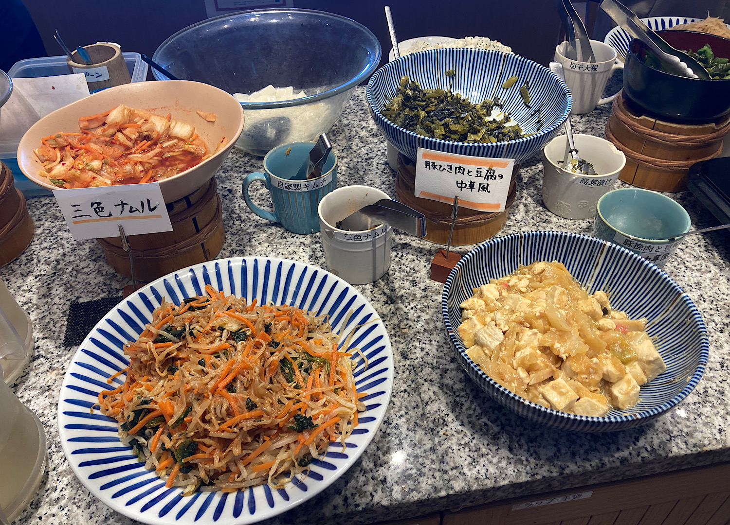 キムチに3色ナムル、韓国風おでん(韓国風おでん!?)、豆腐のあんかけみたいなヤツ……