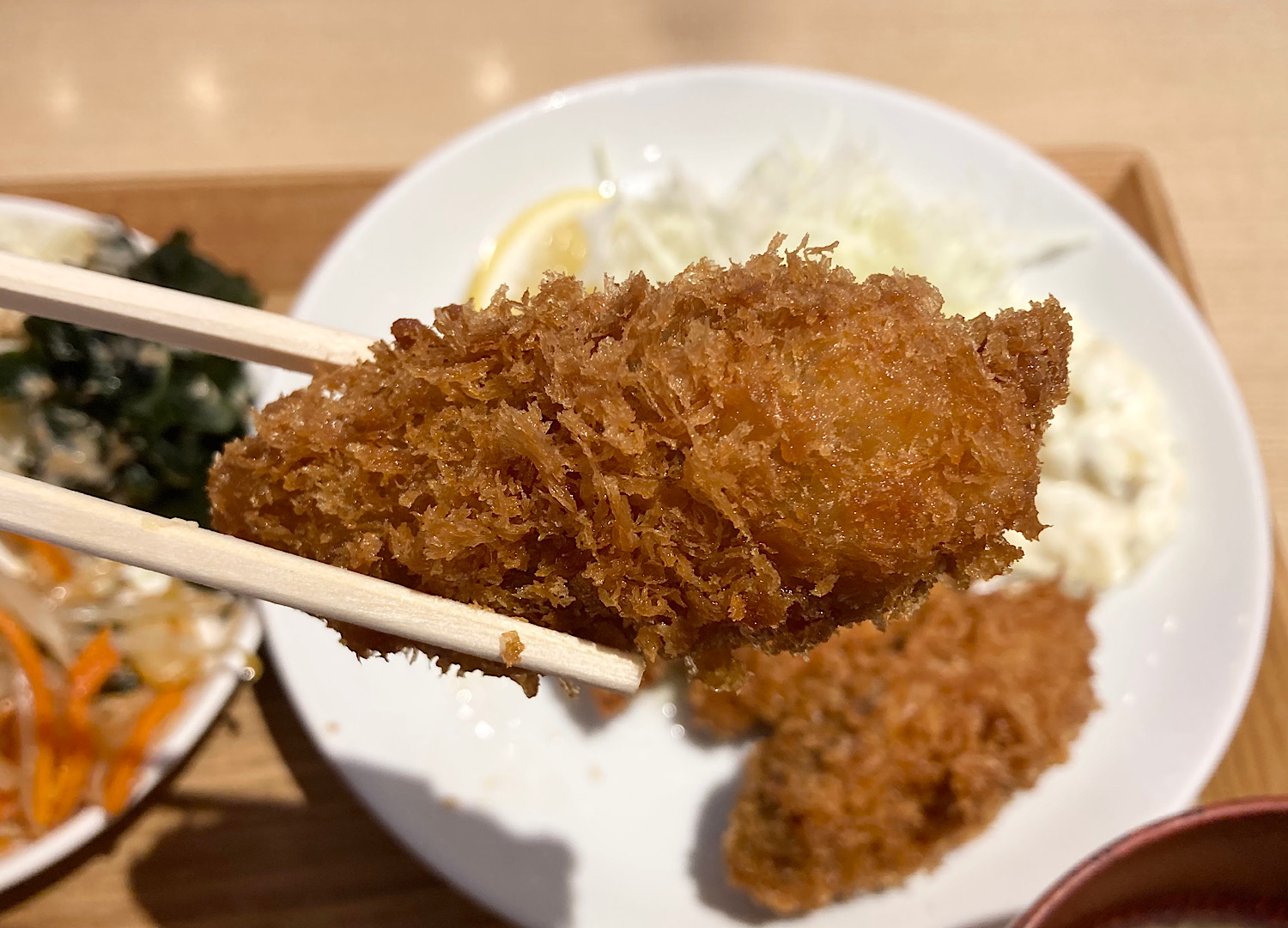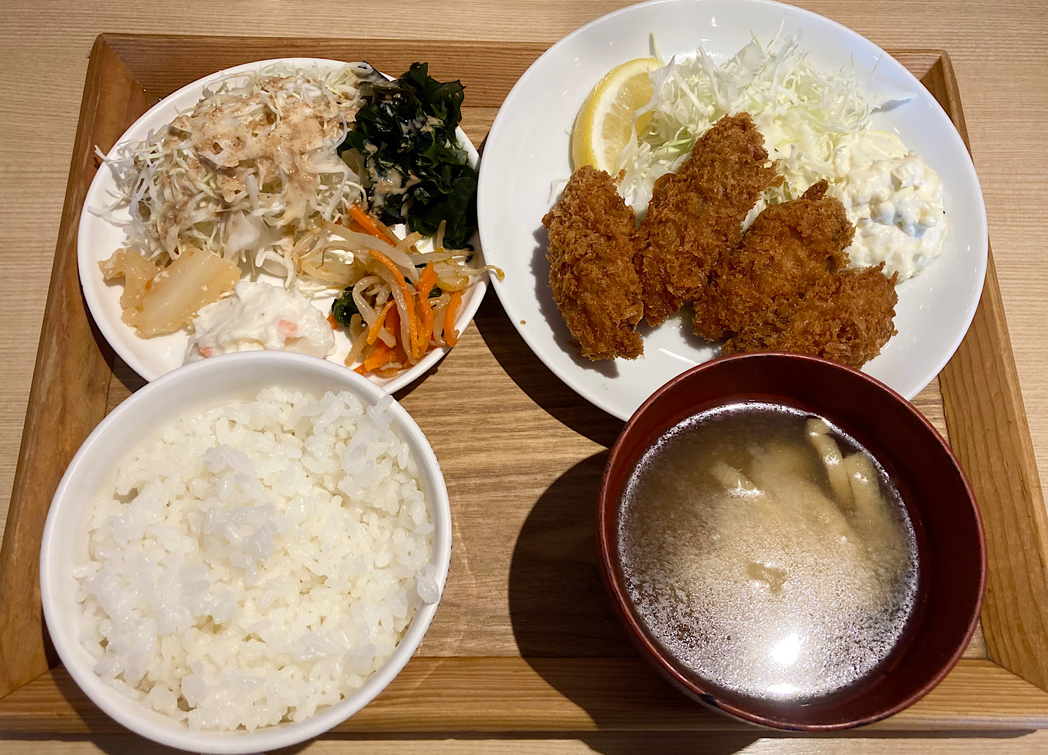 とても一度に全部は取りきれないので、とりあえずサラダ系を。そのうちメインのカキフライ定食も運ばれてきた。