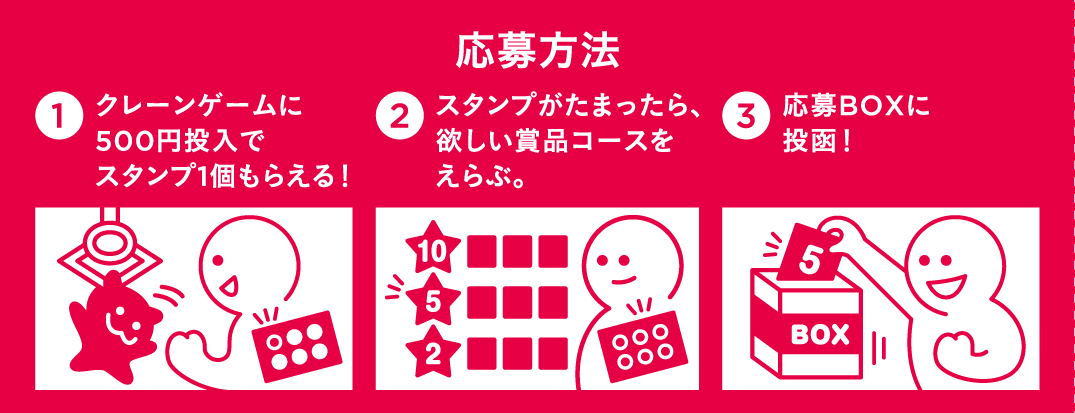 参加方法はいたって簡単。クレーンゲームをプレイすると500円で1つ、専用カードにスタンプがもらえる。欲しい景品に必要な数のスタンプを貯めたら、あとは応募BOXに入れればOK。