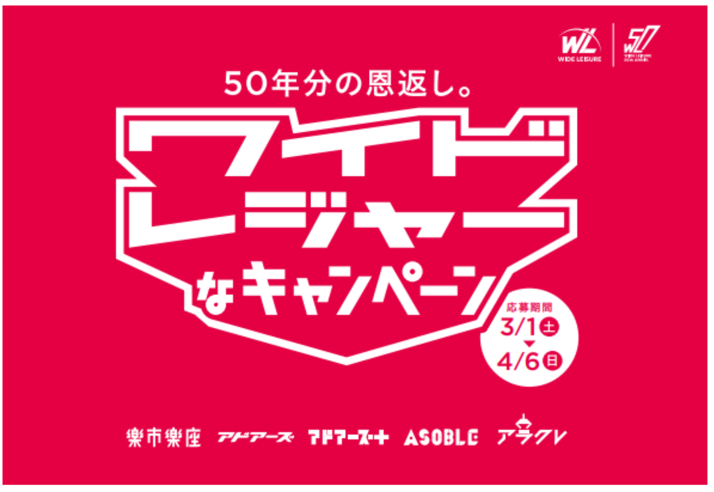 今回ワイドレジャーは50年分の感謝と「社名を覚えてほしい」という切なる願いを込めて、『ワイドレジャーなキャンペーン』を敢行。社名を賭けた……もとい、社名を ”掛けた” キャンペーンである。「そのまんまやないか」というツッコミは、一旦控えよう。