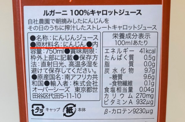 そういえばカルディにもにんじんジュースってあるのかな? と何の気なしにのぞいて発見したのが「ルガーニ 100%キャロットジュース」であった。なお、750ml入りで価格は494円。