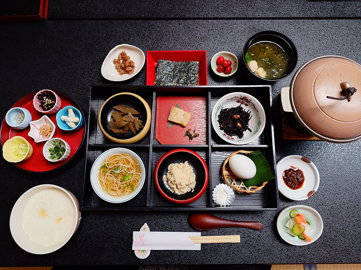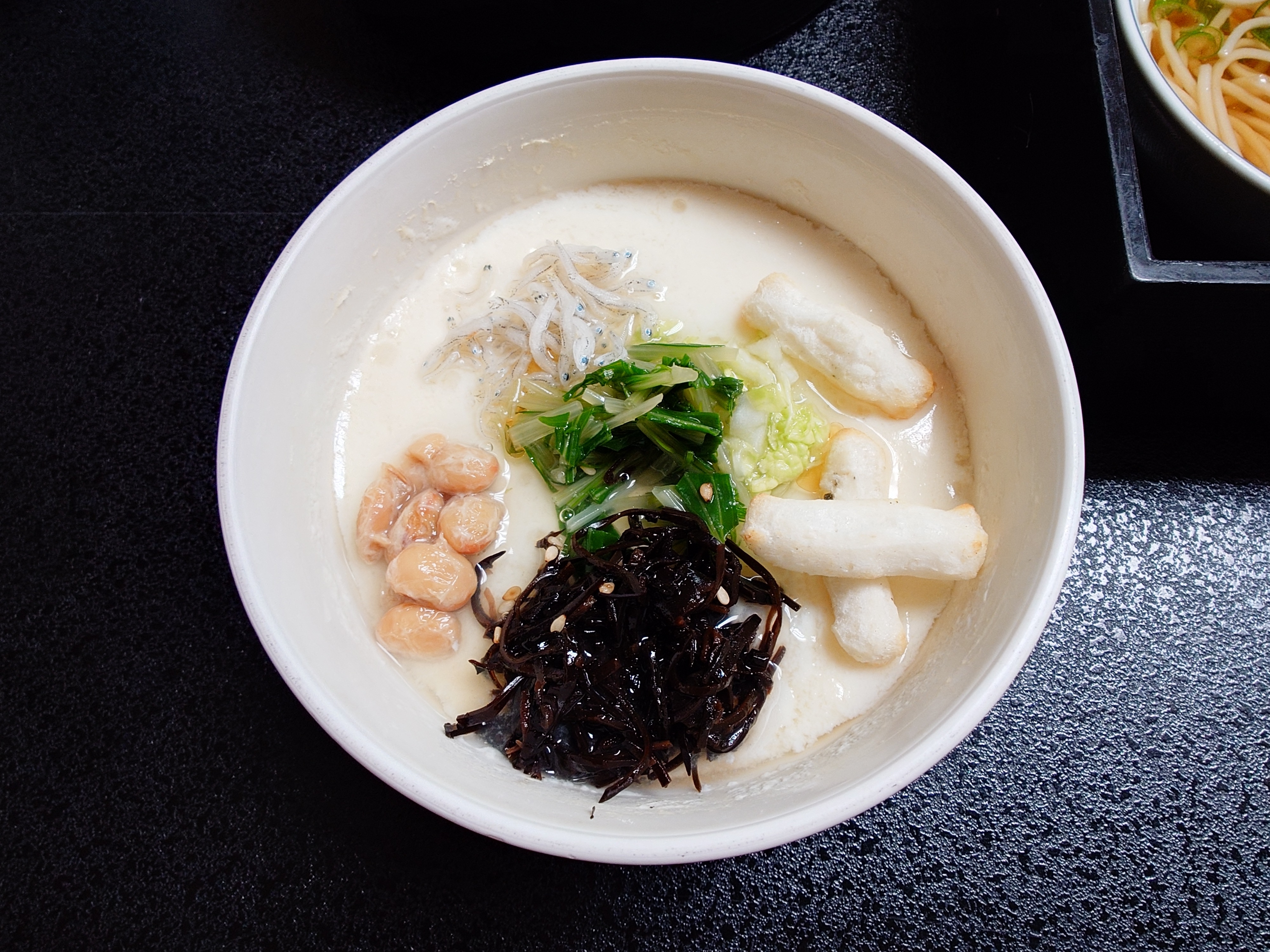 特に豆腐。「岩戸の塩」を作る過程で出るにがりで作ってるそう。上の写真の左端に写ってる白いのだ。薬味を入れて食べるスタイル。
